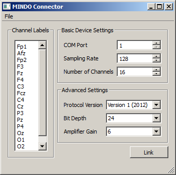 Most of these clients have a similar user interface, which will be shown here using MINDO headsets as an example, which can be obtained from the official LSL distribution ftp mirror site ftp://sccn.ucsd.edu/pub/software/LSL/Apps/. While some clients require that the vendor's native program is running in the background and streaming over the vendor-specific protocol (so that the LSL client can pick it up), some clients connect directly to the hardware. In the case of MINDO Bluetooth headsets, the headset first needs to be paired via Bluetooth (as per vendor instructions), and then the particular device settings can be entered (and saved under File / Save configuration), such as the channel labels, COM port to use, sampling rate, number of channels, protocol version to use, etc. The COM port can be looked up in the Bluetooth device properties. Once all settings are typed in, you can click the Link button to start streaming. If this was successful, the button will turn into an Unlink button that can be pressed to stop streaming (if you get an error message or it does not change into unlink, communication with the device is likely not possible for one or another reason). If the program seems to "hang" while streaming (e.g., battery died), you can check that by clicking unlink, which should immediately turn the button into Link -- if it does not do that, you know for sure that the program is hung.